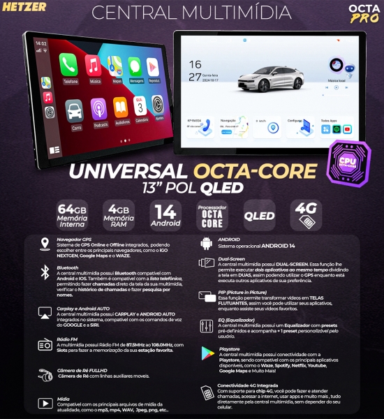 - Radio FM 87.5MHz - 108.0MHz com 18 slots para memorizar